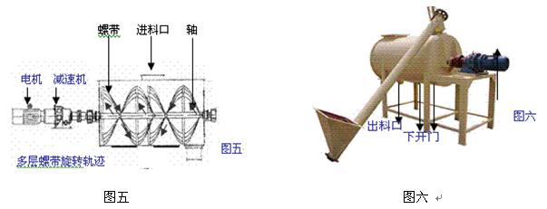 該機采用臥式筒體(圖五),單軸連起內(nèi)外二至三層螺旋帶,可使生產(chǎn)原料向不同的方向充分混合,外層螺帶和筒體間距離極小,放料后殘留少,臥式機體下部設(shè)有 下開活動門,以便更換不同品種時清掃(圖六)。安裝方便,噪音小,混合效率高,適合各種膩子粉、外保溫砂漿等粉體干混料的生產(chǎn),而且價格低廉是小企業(yè)投資 較小的理想生產(chǎn)設(shè)備。